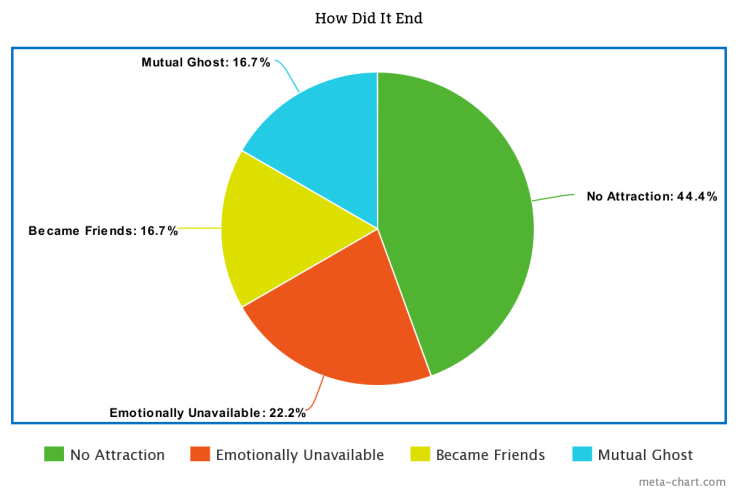 “No attraction” can be either physical or personality-wise. “Emotionally Unavailable” means they either didn’t know what they wanted, or just wanted sex. “Became Friends” means we decided we would be better off as platonic friends. “Mutual Ghost” is defined as when I don’t text them back and then they never text me again either.