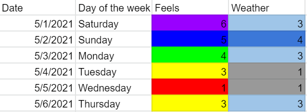 This week, the depression-weather correlation was smaller due to social circumstances. The column after weather is “Notes”, which has what I was so upset/happy about.