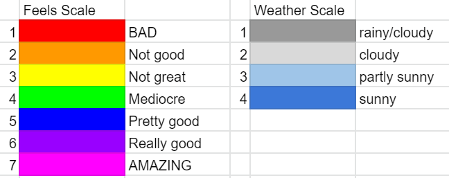 Because I love turning qualitative data into quantitative data, I started writing down how I’m feeling everyday, as well as how it correlates to the weather, because that seems to have a huge influence on how I feel. I can wake up in the morning, and before looking outside, know what the weather is like just based on how I feel. I’ve read it is because the body can sense barometric pressure.