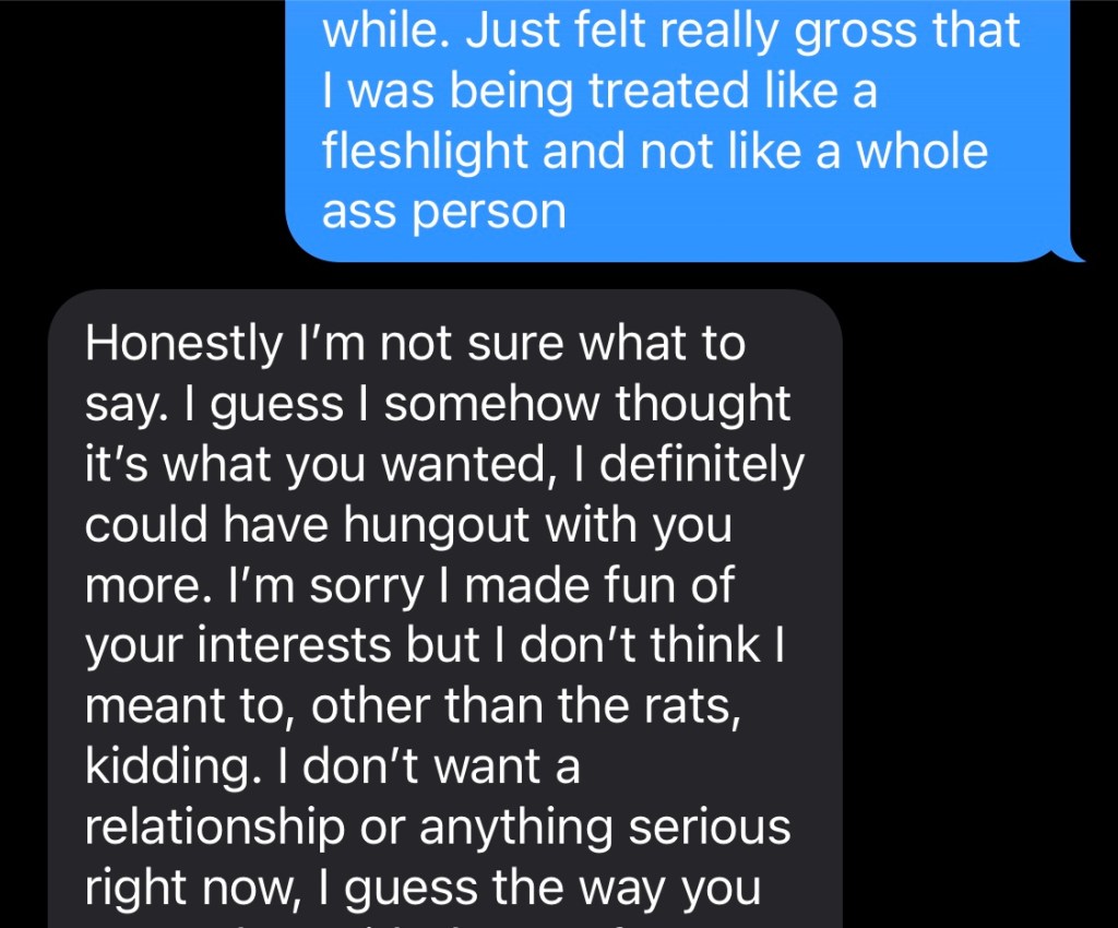 I now have a litmus test on whether or not I can date someone, though; when I bring up my love of rats, if they react badly, then they’re out! Example, one of the most uncomfortable “breakup” texts I’ve ever received (lol):