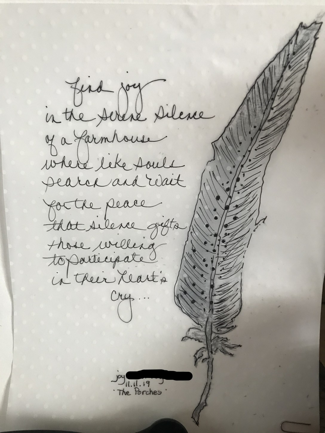 “Joy” : Day One of Retreat November 12, 2019May 1, 2020 andriagrant182 Comments For those of you who don't know, I am on a writing retreat this week. I'm staying at The Porches in Norwood, Virginia. This first post is about one of the other writers here.